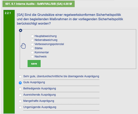 Über das Hand-Icon kannst du Kommentare, Nachweise und z.B. Abweichungen freihändig einfügen. Falls die angebotenen Kategorien nicht (wie hier) einigermaßen selbsterklärend sind oder du die Option "Maßnahmenplan" wie in Abb. 1 gezeigt vermisst, frage ggf. den Projekt-Administrator ob, und welche Kategorie Voraussetzung für den Maßnahmenplan ist.