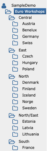 Die Struktur der Ebenen kann jederzeit geändert werden. Um beispielsweise die Ebene "Central" in "Central-South" und "Central-North" aufzuteilen, werden diese Ebenen zum Ordner "Central" hinzugefügt, und anschließend z.B. der gesamte Zweig "Austria nach "Central-South" und "Germany" nach "Central-North" verschoben.