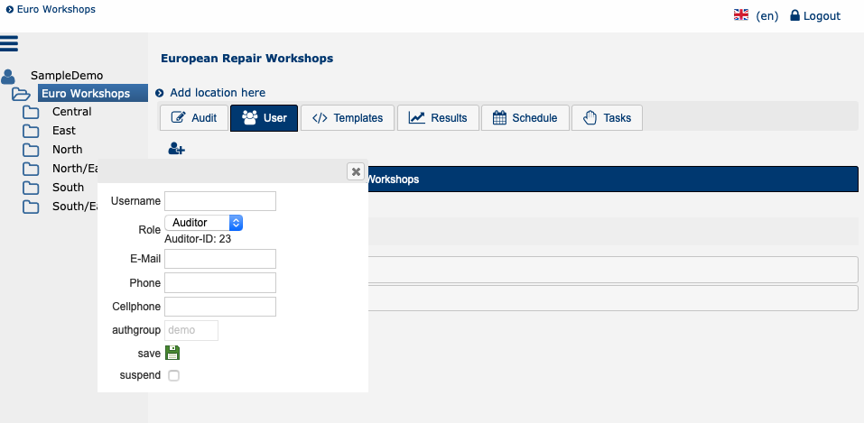 In order to add new users, select the user tab and click the avatar marked with the plus-icon. "Username" and "E-Mail" are mandatory. Aditionally, you have to assign one of the three available user roles (admin, auditor or customer [=right to read data only]), to enable the new user to work with auditbus.